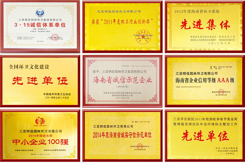 2017年2月1日,分別被三亞市園林環(huán)衛(wèi)局、吉陽區(qū)環(huán)衛(wèi)所、天涯區(qū)城管局、海棠區(qū)城管局及三亞市愛衛(wèi)辦等主管部門評(píng)定為“環(huán)境衛(wèi)生先進(jìn)外包企業(yè)”